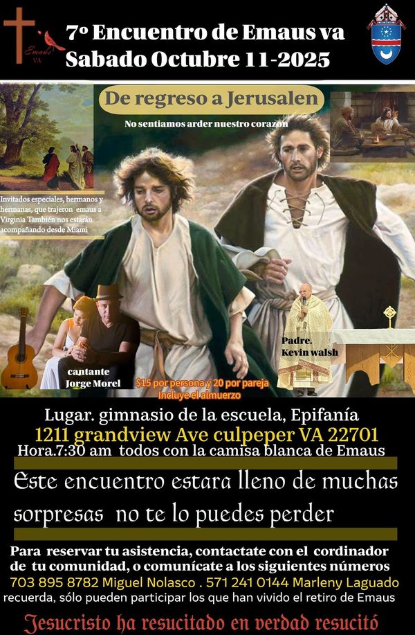 El Movimiento de Emaús Virginia te invita a nuestro Séptimo Encuentro Anual de Emaús . No te pierdas la oportunidad de reencontrarte con tu hermano una vez vivido tu retiro de Emaús. Te esperamos, habrá muchas sorpresas.